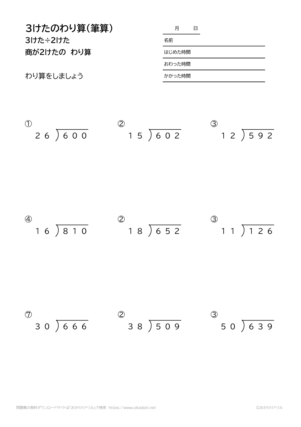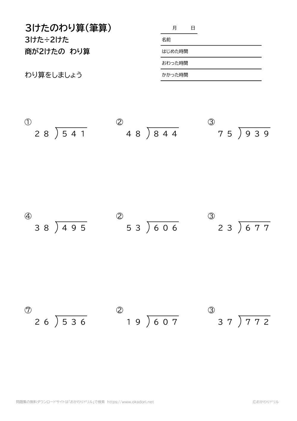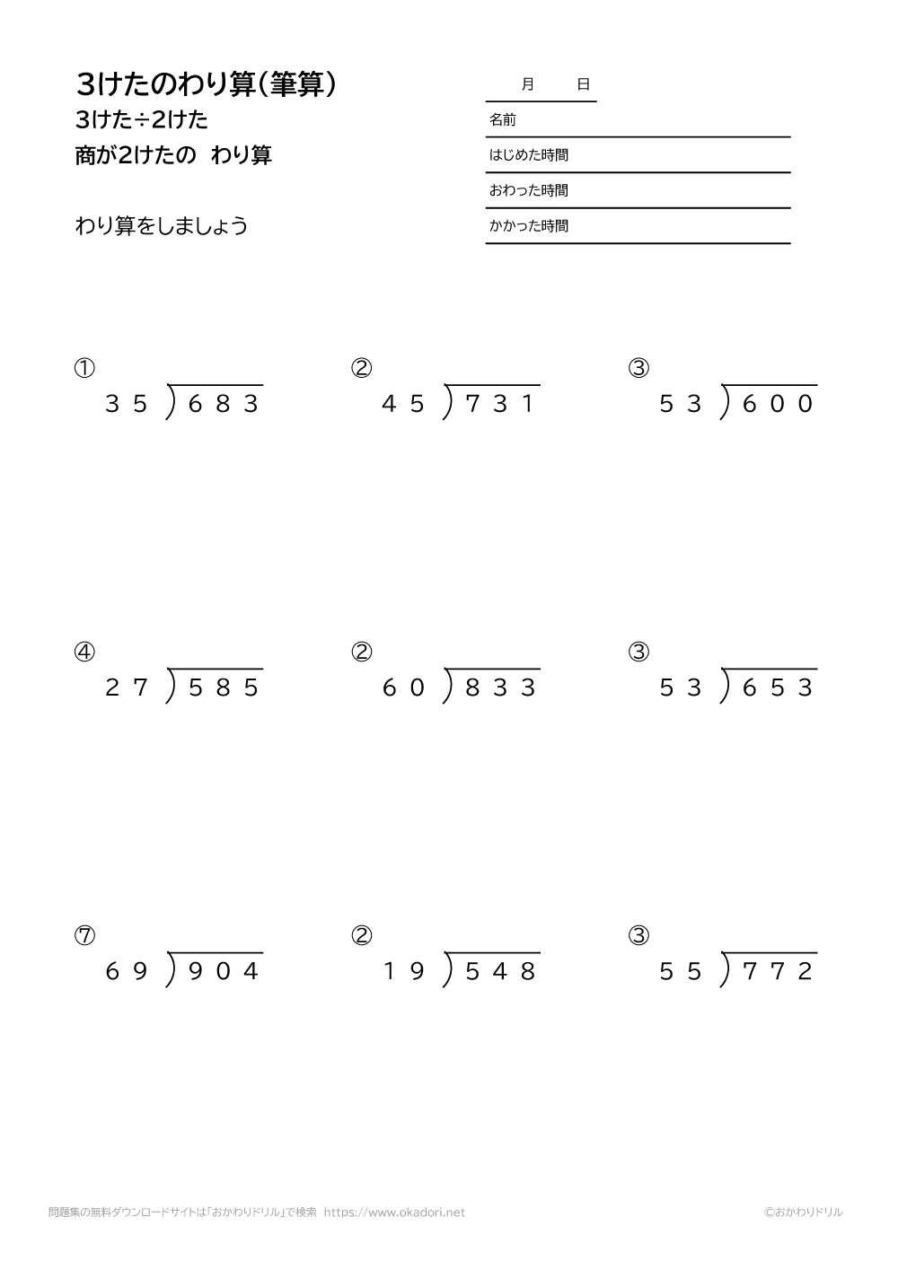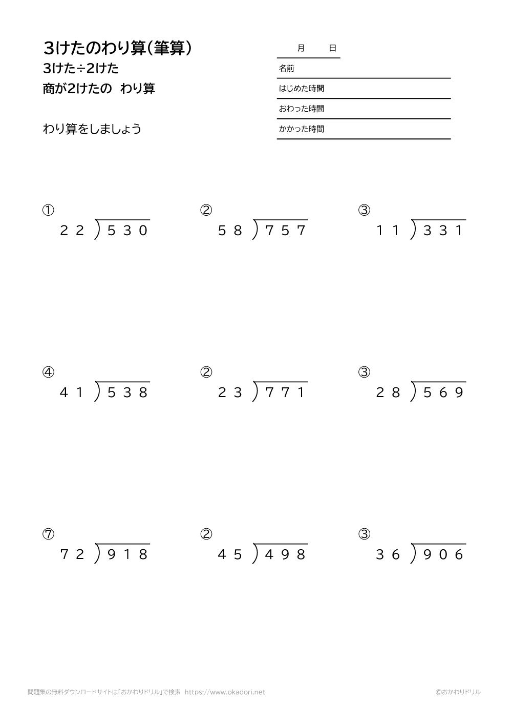 3桁と2桁の割り算の問題です。割り切れないときは余りが出ることに注意して割り算を解く問題です。