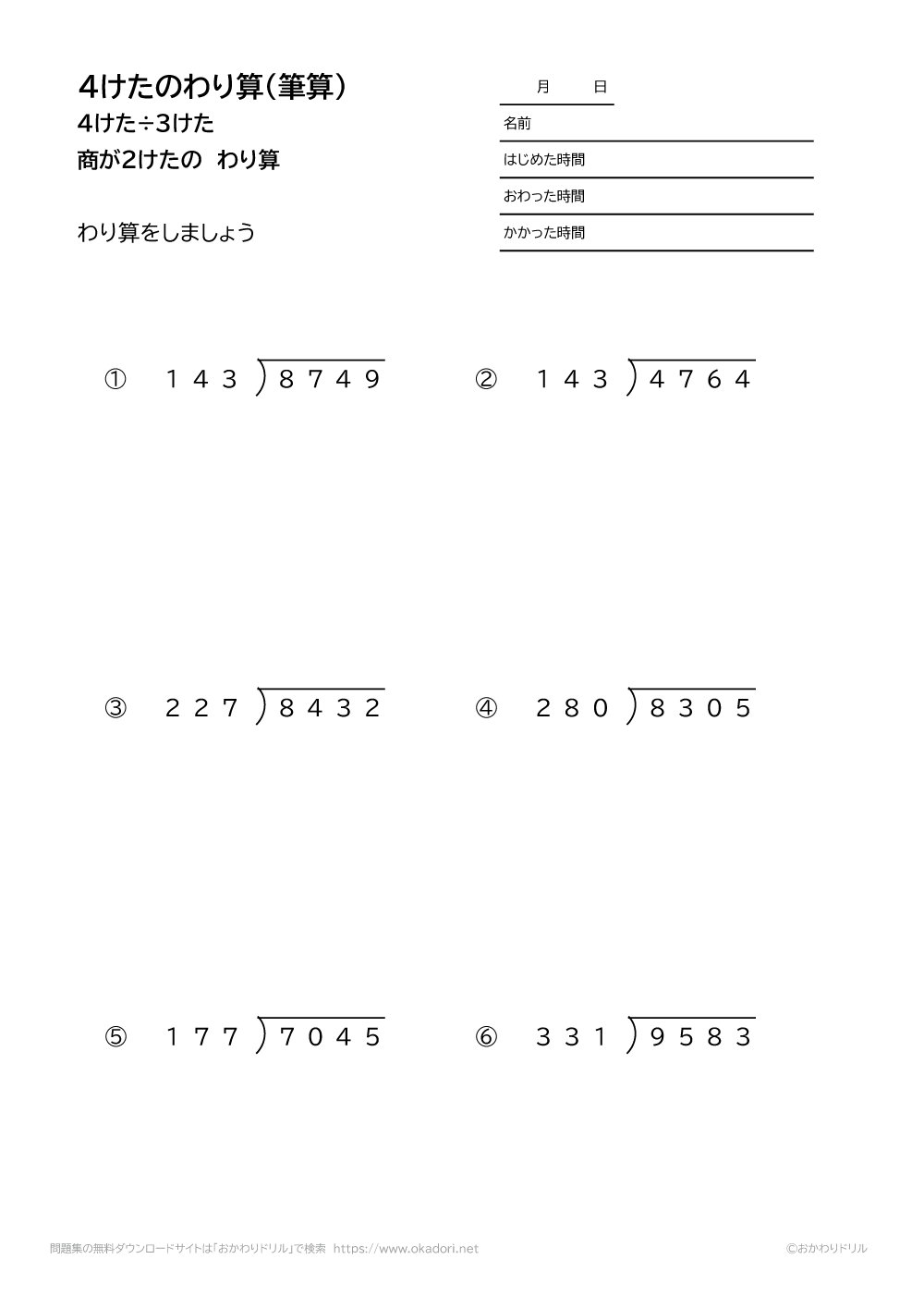 このページは、小学4年生が割り算の筆算を学習するための「4桁÷3桁の商が2桁になる割り算」が学習できるページです。