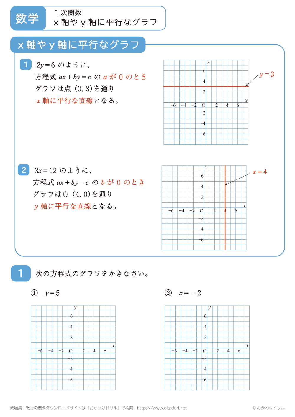 このページは、中学2年生で習う「x軸やy軸に平行なグラフ」が学習できるページです。